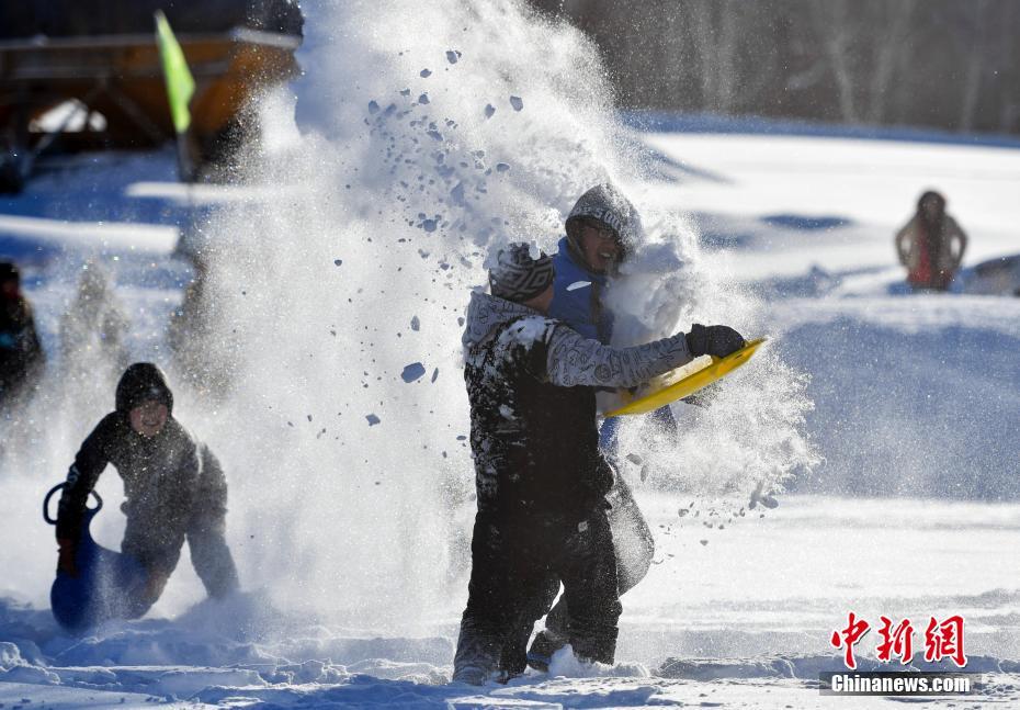 1月1日,新年第一天,地处新疆阿勒泰山深处,被誉为“神的自留地”的禾木村,大批游客聚集于此与当地民众一起泼雪狂欢,迎接新年到来。近日的一场大雪令禾木村的积雪厚度达到50厘米左右,也将大山深处的禾木村装扮的如同“童话世界”,新疆喀纳斯冰雪风情旅游季也正式拉开帷幕。图为游客向当地民俗表演队泼雪,表达祝福。