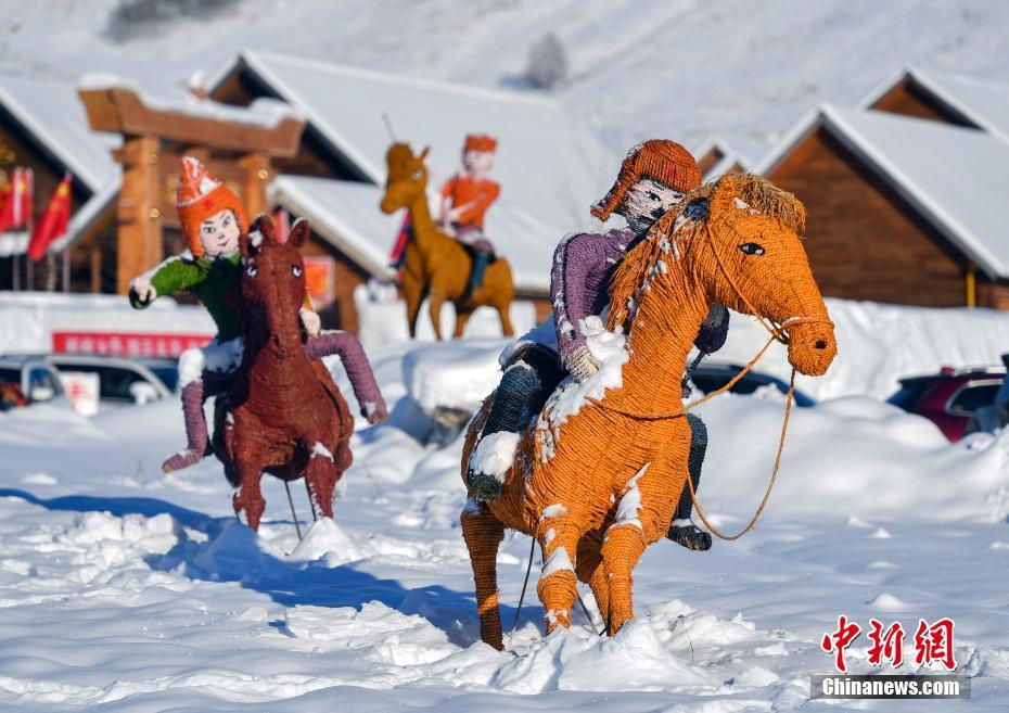 1月1日,地处新疆阿勒泰山深处,被誉为“神的自留地”的禾木村,用草绳编织的卡通“稻草人”栩栩如生,再现当地民众游牧生活。近日的一场大雪令禾木村的积雪厚度达到50厘米左右,也将大山深处的禾木村装扮的如同“童话世界”,新疆喀纳斯冰雪风情旅游季也正式拉开帷幕。中新社记者 刘新 摄