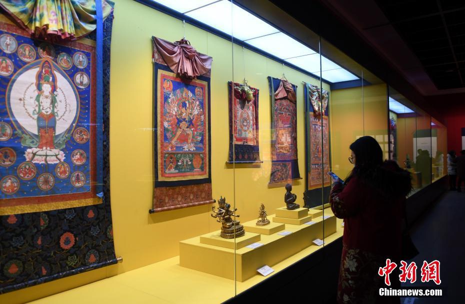 1月12日,117件唐代以来的藏族文物在浙江杭州西湖畔展出,蜚声海内外的唐卡、妙相庄严的造像、工艺精良的法器等各类文物珍品展示了雪域文明的深厚底蕴、历史成就与艺术魅力。中新社记者 王刚 摄