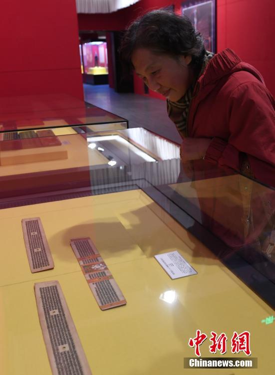 1月12日,参观者欣赏公元7至8世纪的梵文佛经。当日,117件唐代以来的藏族文物在浙江杭州西湖畔展出,蜚声海内外的唐卡、妙相庄严的造像、工艺精良的法器等各类文物珍品展示了雪域文明的深厚底蕴、历史成就与艺术魅力。中新社记者 王刚 摄
