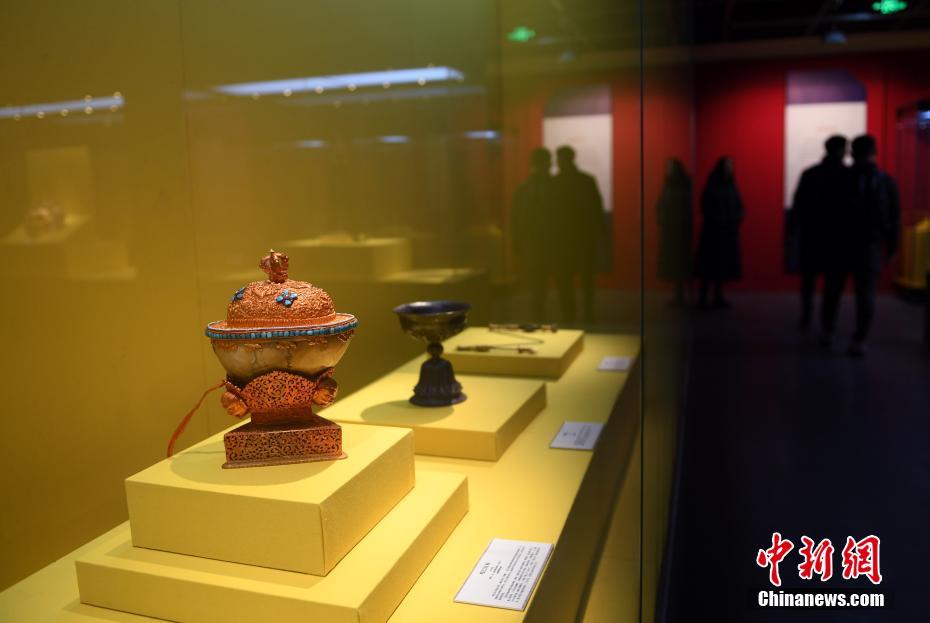 1月12日,由藏族高僧头盖骨加纯金打造的嘎巴拉碗在西子湖畔展出。当日,117件唐代以来的藏族文物在浙江杭州西湖畔展出,蜚声海内外的唐卡、妙相庄严的造像、工艺精良的法器等各类文物珍品展示了雪域文明的深厚底蕴、历史成就与艺术魅力。中新社记者 王刚 摄