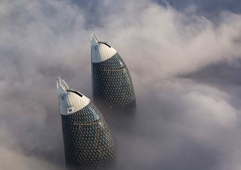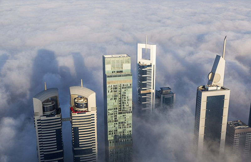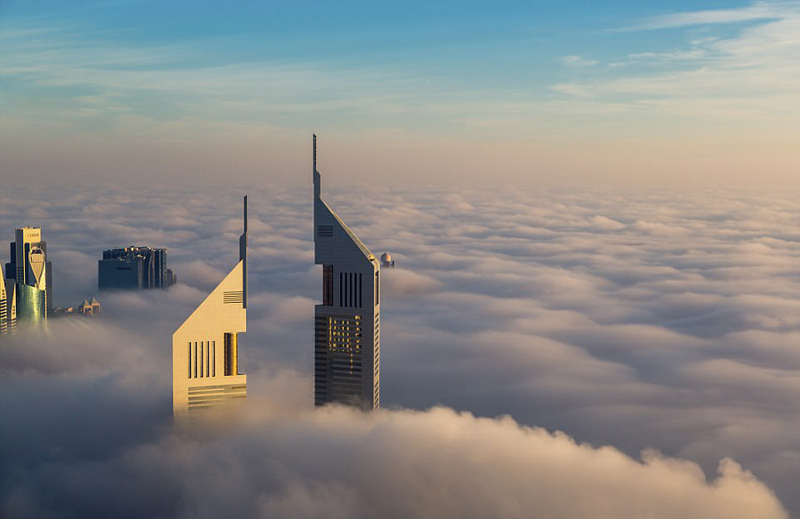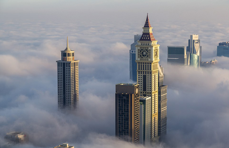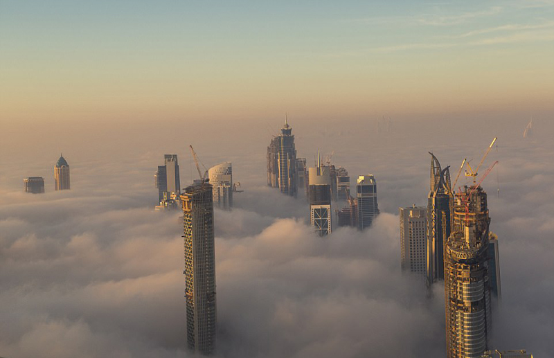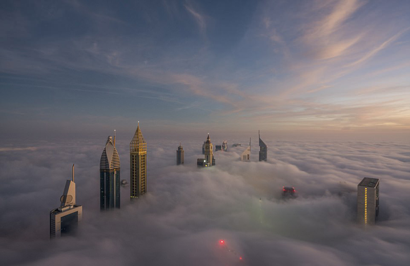 据英国《每日邮报》1月16日报道,近日,一名在阿联酋迪拜住了28年的印度籍商人拉斯特姆•阿兹米(Rustam Azmi),在迪拜一幢摩天大楼的高层里拍下了一组浓雾中高楼耸立、直穿云霄的罕见照片。