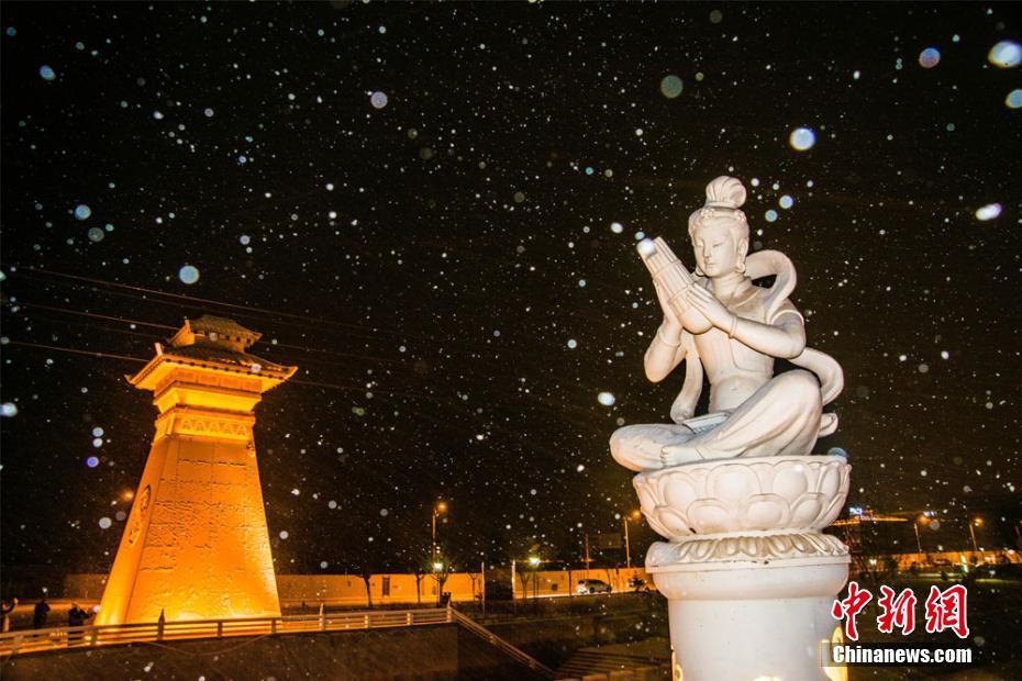 1月20日夜晚,敦煌市党河风情线落雪的场景。 王斌银 摄