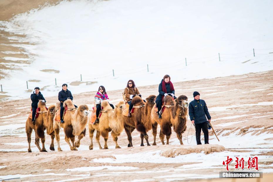 1月21日,游客骑骆驼畅游难得一见的“大漠雪景”。 王斌银 摄