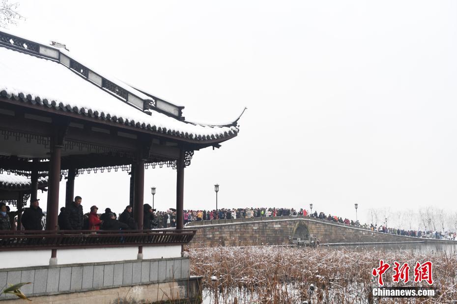1月26日,雪后的断桥吸引了众多游客及市民前来观赏。连日来,受寒流影响,浙江杭州降大雪,西湖景区银装素裹美如画。中新社记者 王远 摄