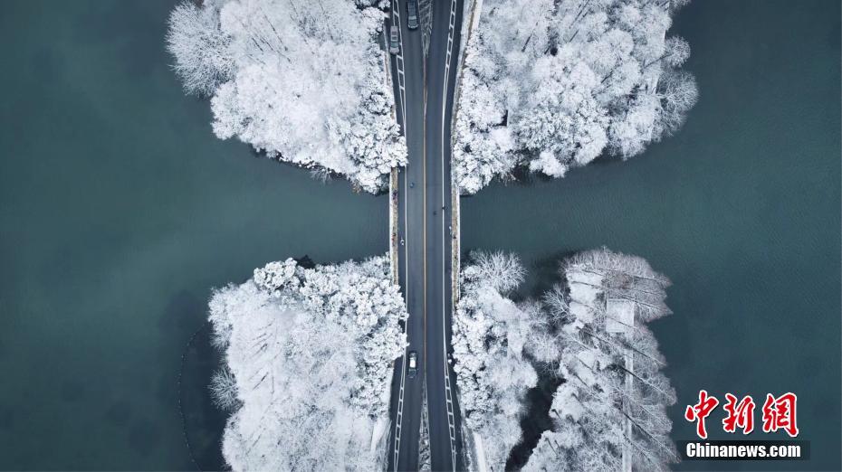 1月26日,航拍下的杭州西湖杨公堤别有一番风味。受冷空气影响,杭州24日迎来入冬首场降雪,雪后的断桥、杨公堤、孤山等景点人潮涌动,民众争相一睹“雪西湖”。中新社记者 徐�h 摄