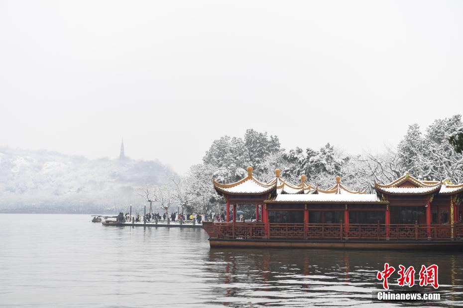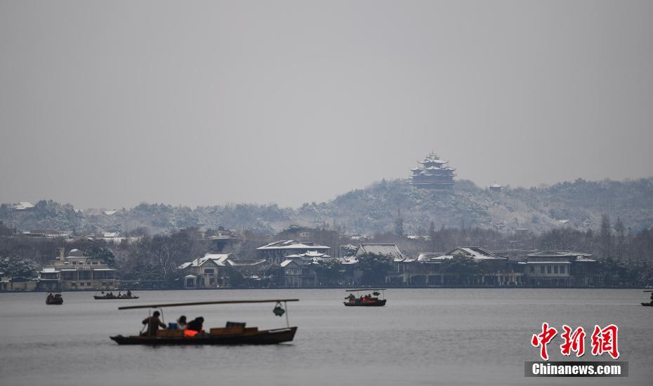 1月26日,游客乘坐游船赏西湖雪景。连日来,受寒流影响,浙江杭州降大雪,西湖景区银装素裹美如画。中新社记者 王远 摄