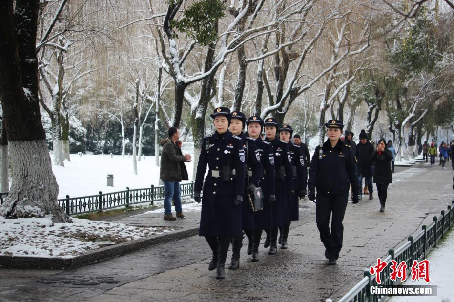 1月26日,雨雪中的西湖女子巡逻队依然坚守岗位。受冷空气影响,杭州24日迎来入冬首场降雪,雪后的断桥、杨公堤、孤山等景点人潮涌动,民众争相一睹“雪西湖”。中新社记者 王潇婧 摄
