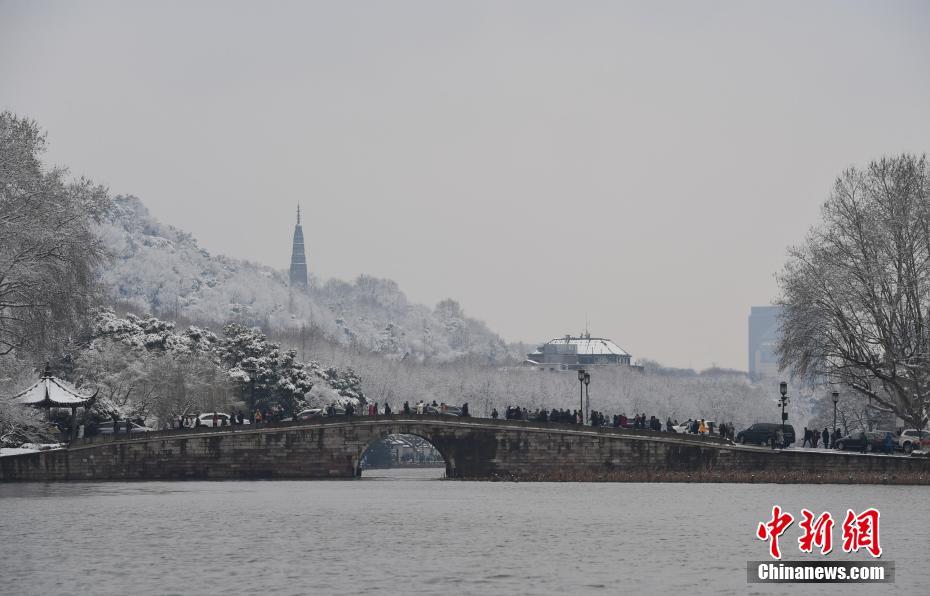 1月26日,西湖西泠桥人来人往。连日来,受寒流影响,浙江杭州降大雪,西湖景区银装素裹美如画。中新社记者 王远 摄