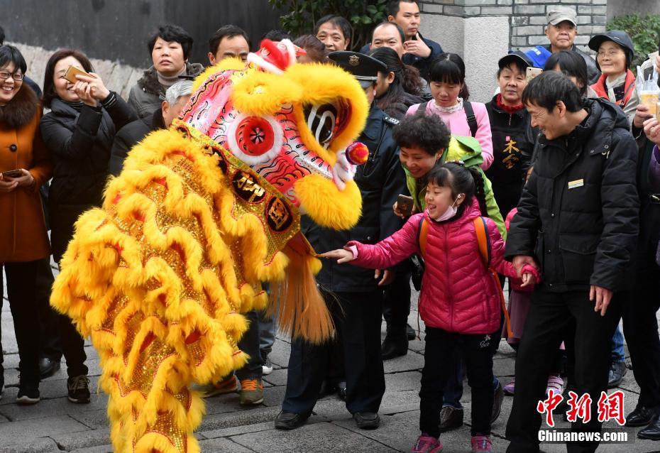 2月8日,在福州三坊七巷,“最福州,醉新春”2018福州春季坊巷文化节之福州十邑民俗踩街活动启幕,活动包括十二婆姐送平安、舞狮子、电音三太子、肩头戏、走高跷等表演。图为舞狮表演者与民众互动。中新社记者 吕明 摄