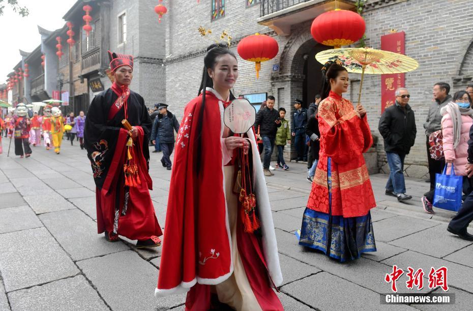 2月8日,在福州三坊七巷,“最福州,醉新春”2018福州春季坊巷文化节之福州十邑民俗踩街活动启幕,活动包括十二婆姐送平安、舞狮子、电音三太子、肩头戏、走高跷等表演。图为身穿汉服的表演者为民众送祝福。中新社记者 吕明 摄
