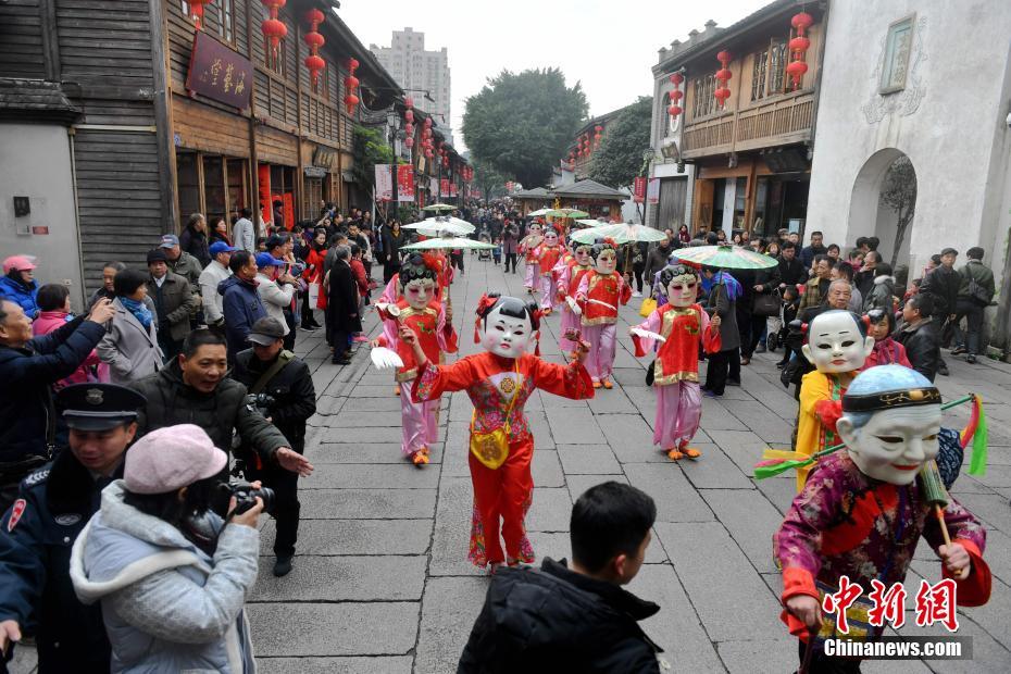 2月8日,在福州三坊七巷,“最福州,醉新春”2018福州春季坊巷文化节之福州十邑民俗踩街活动启幕,活动包括十二婆姐送平安、舞狮子、电音三太子、肩头戏、走高跷等表演。图为十二婆姐送平安表演。中新社记者 吕明 摄