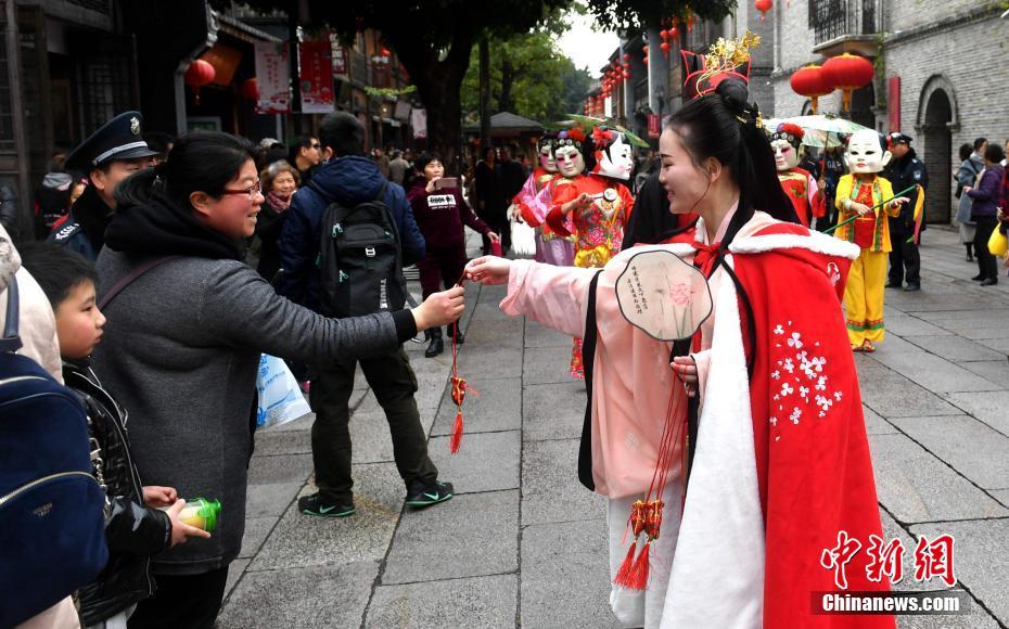2月8日,在福州三坊七巷,“最福州,醉新春”2018福州春季坊巷文化节之福州十邑民俗踩街活动启幕,活动包括十二婆姐送平安、舞狮子、电音三太子、肩头戏、走高跷等表演。图为身穿汉服的女子送路人礼物。中新社记者 吕明 摄