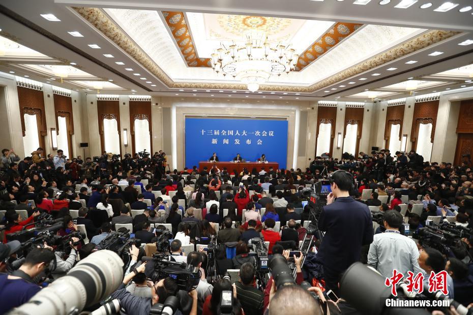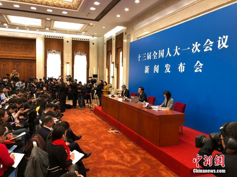 十三届全国人大一次会议于3月4日上午11时在人民大会堂新闻发布厅举行新闻发布会。大会发言人张业遂就大会议程和人大工作相关的问题回答中外记者的提问。中新社记者 侯宇 摄