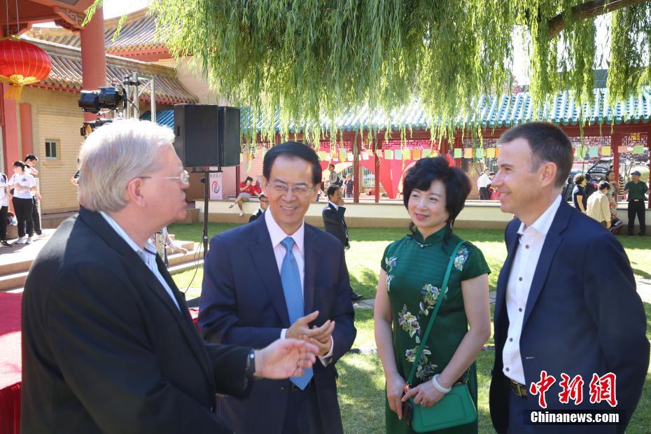 3月4日,中国驻澳大利亚大使馆在堪培拉举行“中国日”活动,吸引近两千名当地民众和华侨华人参与。图为中国驻澳大使成竞业(左二)和夫人王芳(右二)与来宾交谈。中新社记者 陶社兰 摄