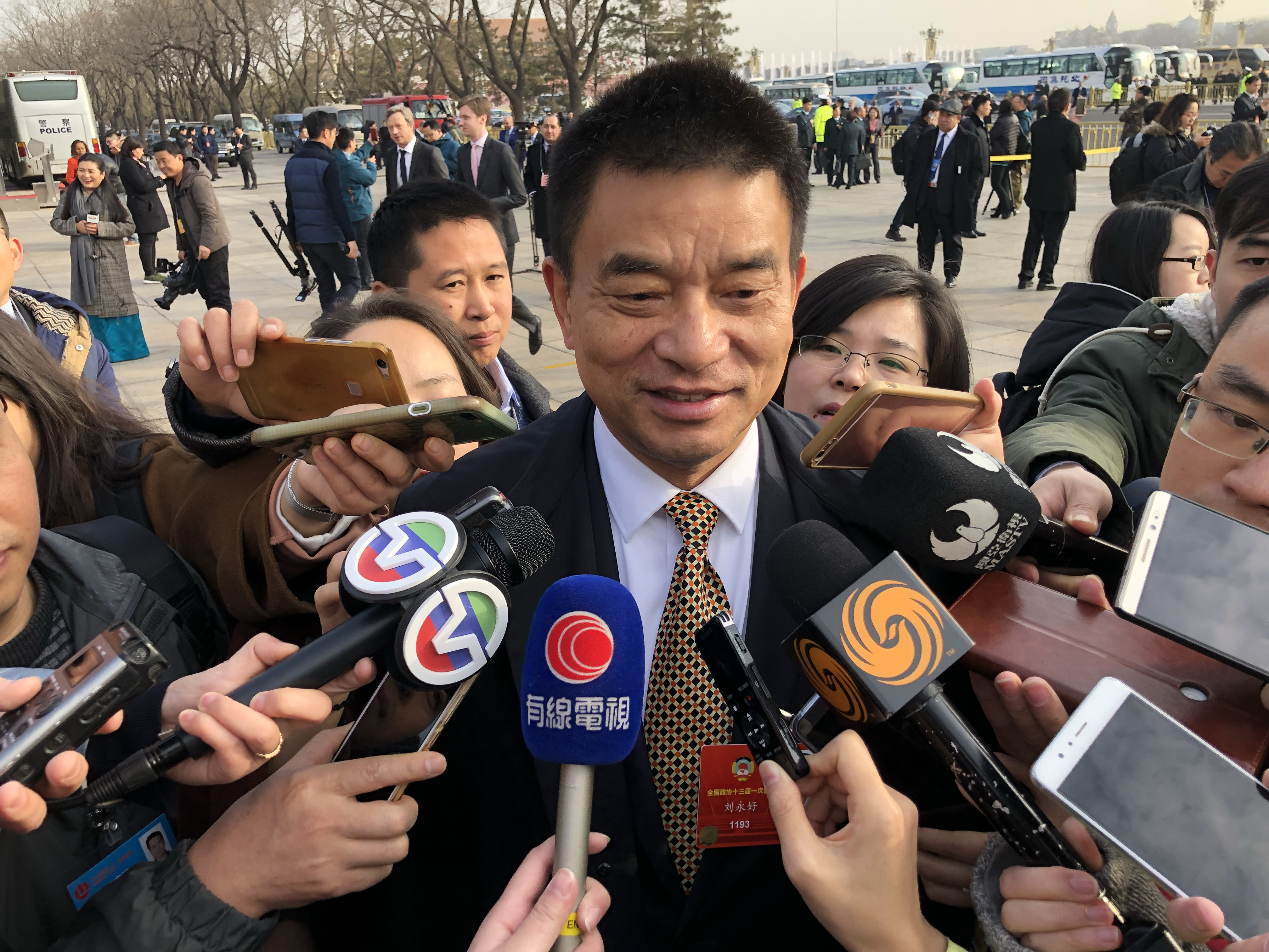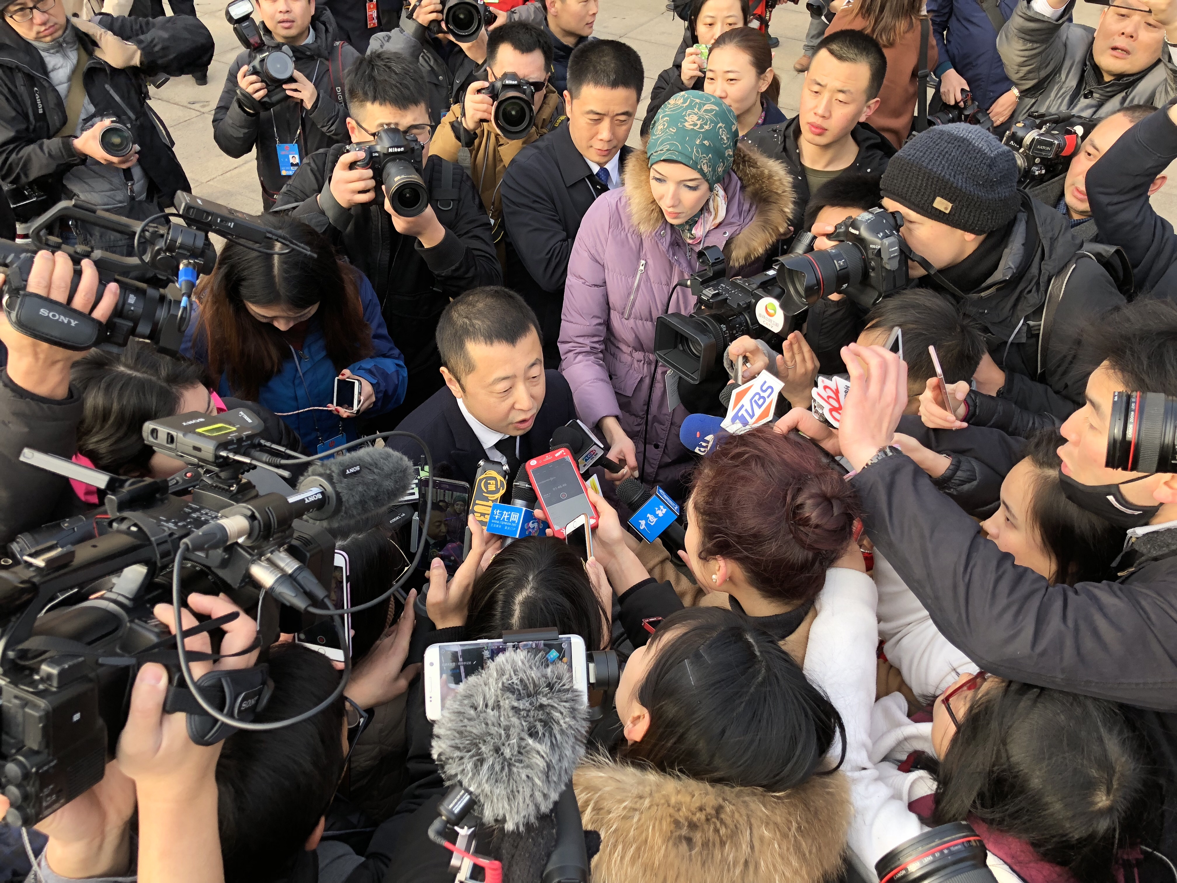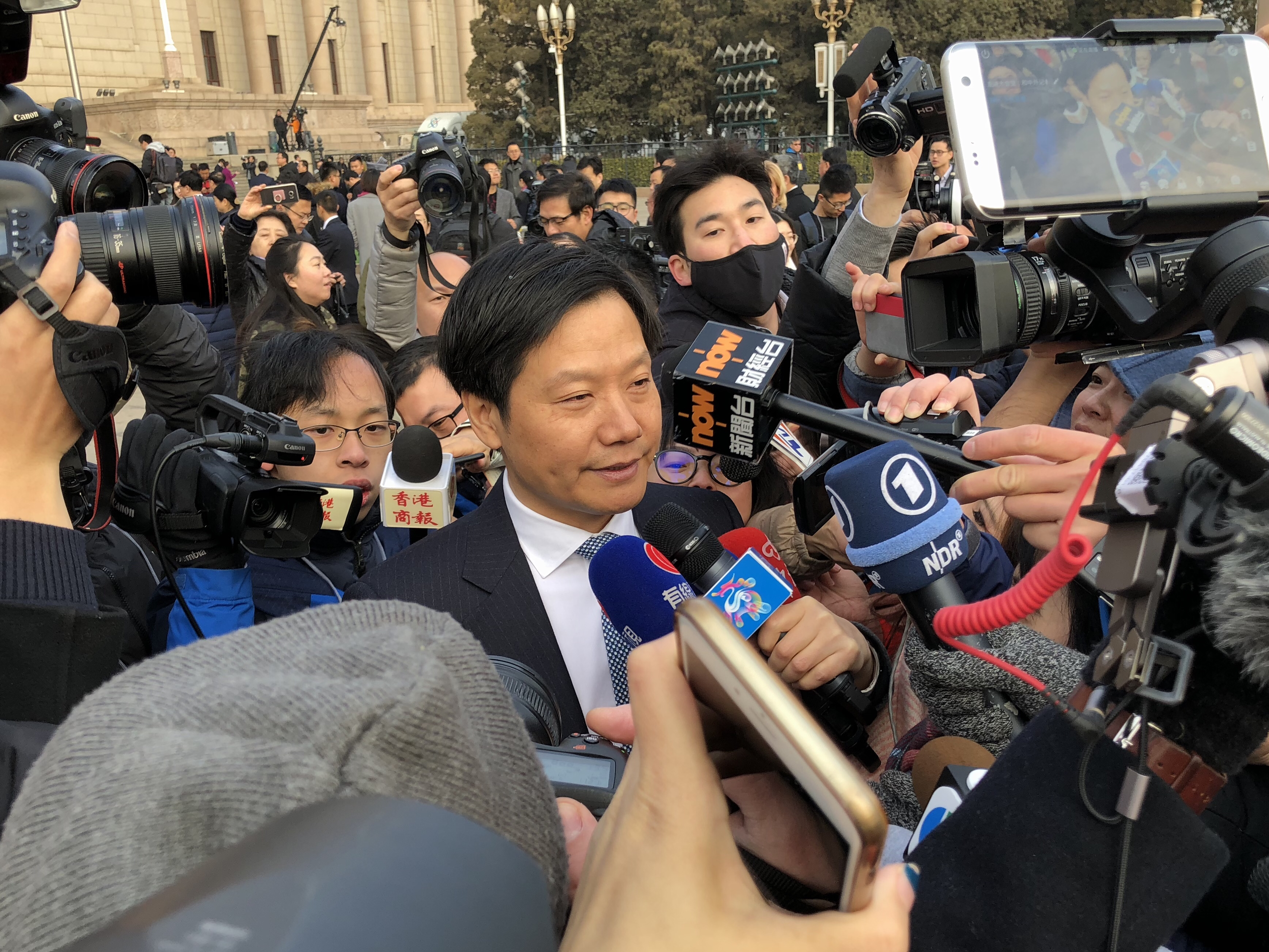 正在接受记者采访的全国人大代表、小米公司董事长雷军
