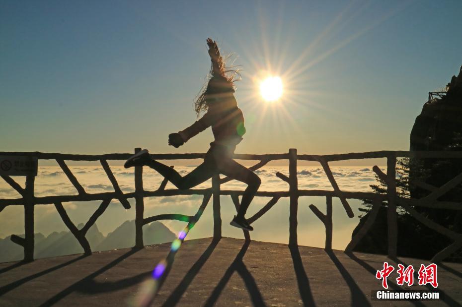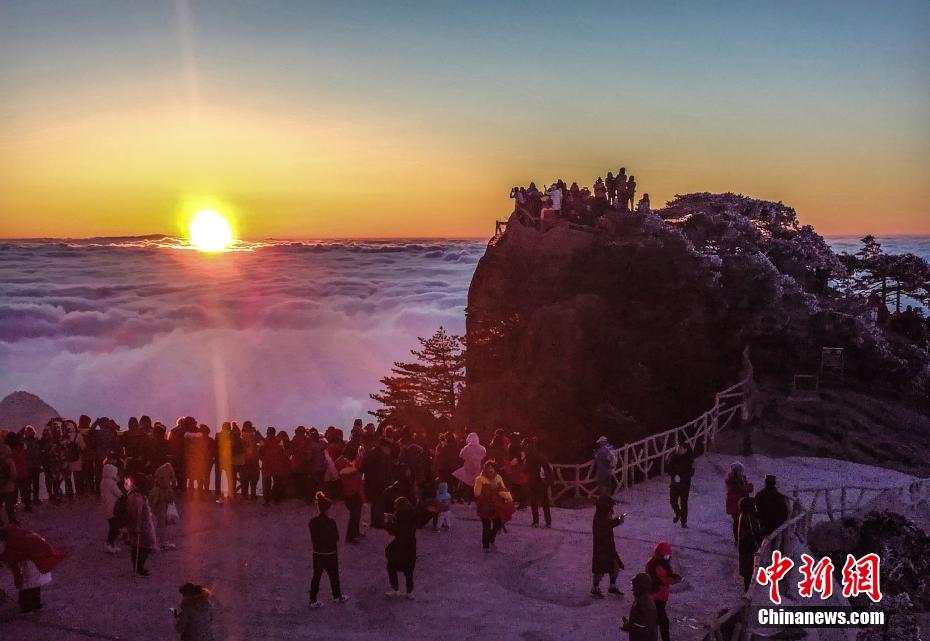 黄山云海雾凇日出齐上阵,引游客纷纷驻足欣赏留影。 李金刚 摄