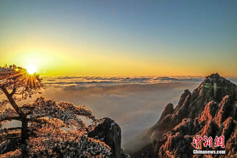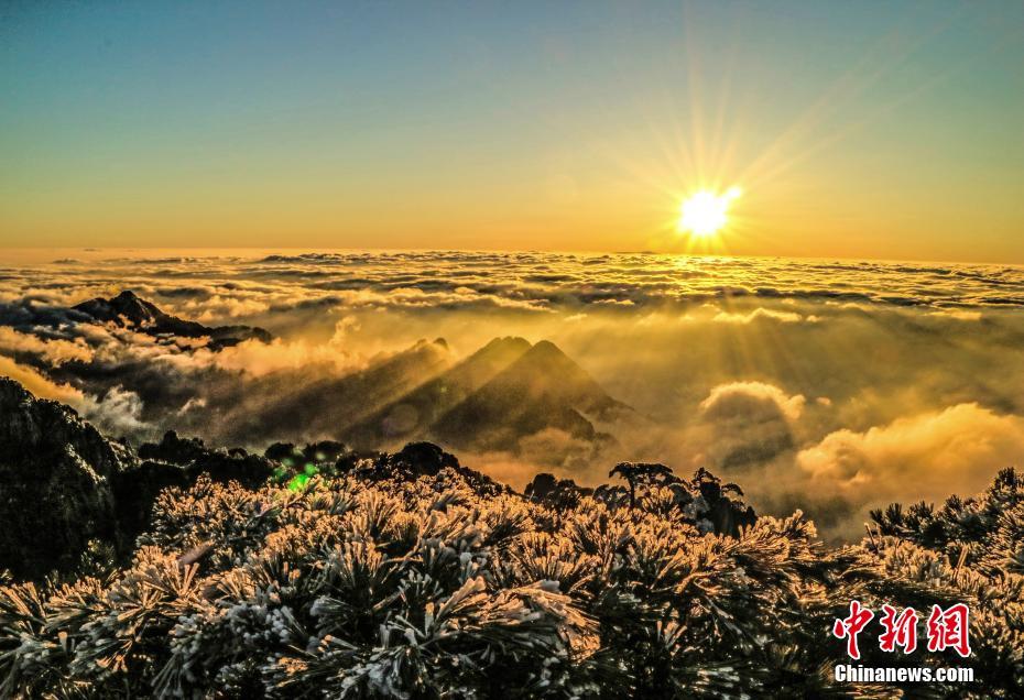 由于冷空气影响,前日黄山出现雾凇景观。清晨6时24分,黄山旭日初升,阳光为包裹着冰晶的松针和花木镶上一层金边,云蒸霞蔚,美不胜收。图为日出时分,阳光将翻滚的云海和晶莹的雾凇染上一层金边。 李金刚 摄