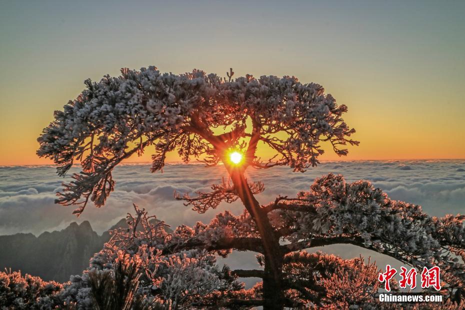 3月9日早晨,安徽黄山风景区涌现大面积的云海。当日早上,无边无际的腾云如潮水般翻滚而来,气势磅礴,与奇松怪石和绚丽的日出,构成了一幅壮丽的画卷。图为日出时,阳光穿过挂满雾凇的枝丫。 李金刚 摄