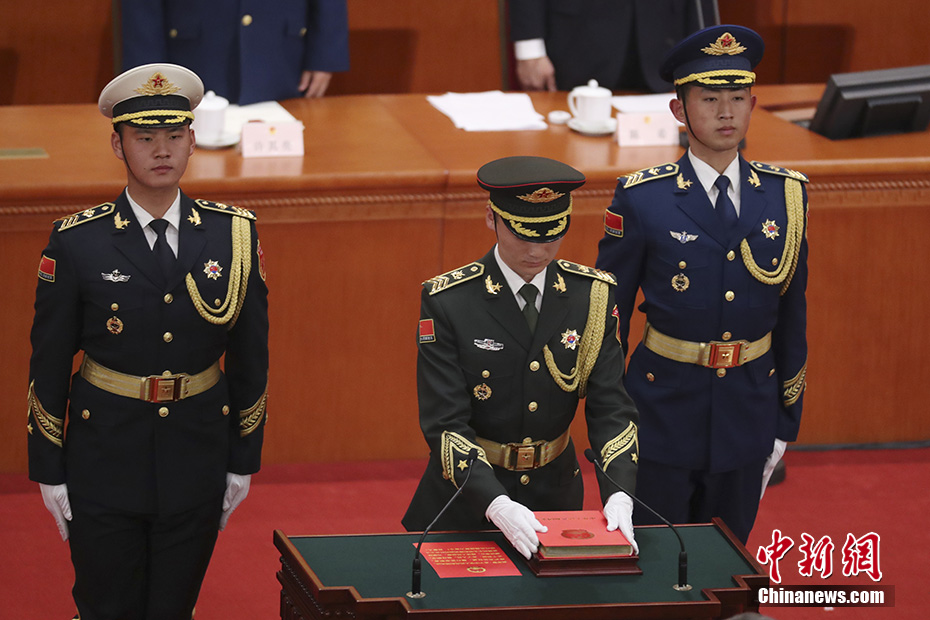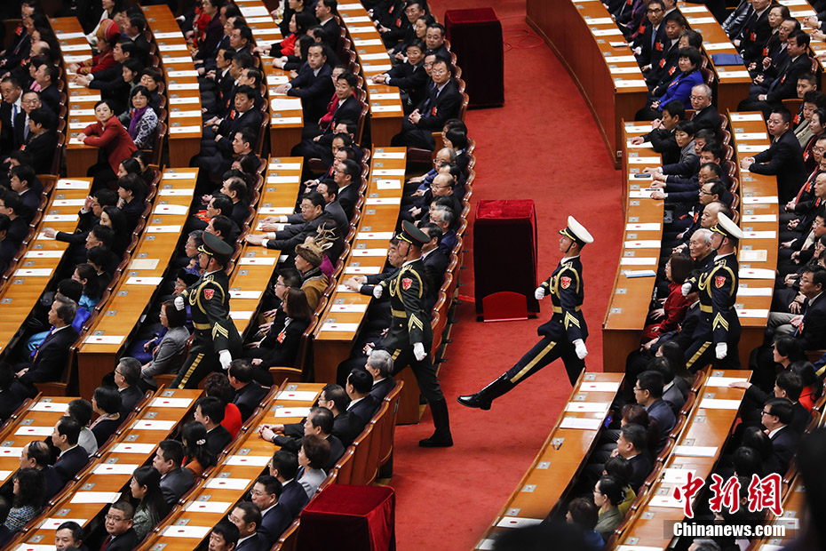3月17日,十三届全国人大一次会议在北京人民大会堂举行第五次全体会议。全体会议各项议程进行完毕后,举行中华人民共和国第十三届全国人民代表大会第一次会议宪法宣誓仪式。图为陆海空三军仪仗兵入场。中新社记者 杜洋 摄