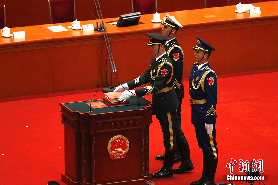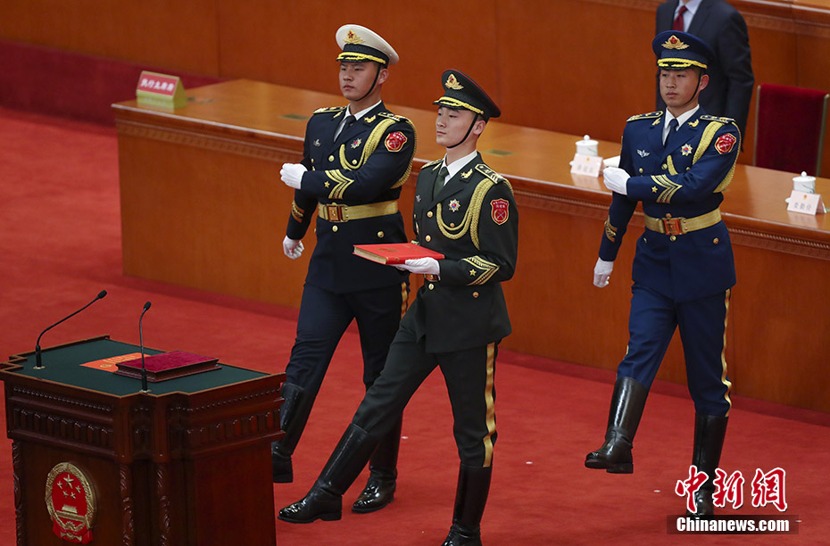 3月17日,十三届全国人大一次会议在北京人民大会堂举行第五次全体会议。全体会议各项议程进行完毕后,举行中华人民共和国第十三届全国人民代表大会第一次会议宪法宣誓仪式。图为3名礼兵护送《中华人民共和国宪法》入场,并将宪法放置于宣誓台上。中新社记者 盛佳鹏 摄