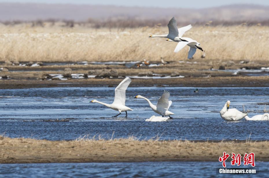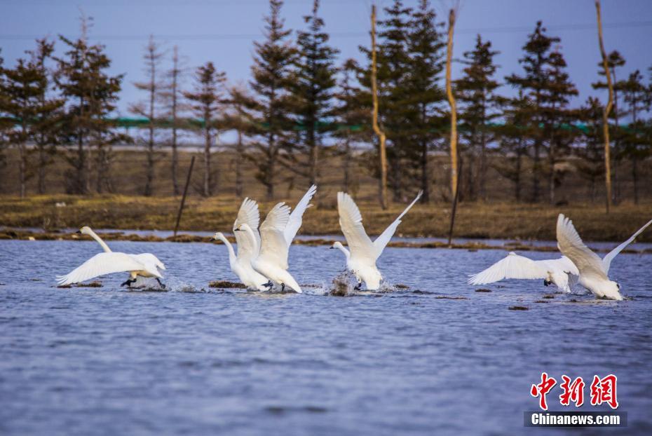 3月20日,天鹅在湖面上“舞蹈”。日前,内蒙古自治区呼伦贝尔市陈巴尔虎旗陆续迎来大量北归天鹅。据了解,每年四月份,成群的天鹅从中国南方迁徙到呼伦贝尔产卵繁殖,而今年三月中旬起,陈巴尔虎旗境内便迎来大量回归天鹅,实属罕见。中新社记者 武军 摄