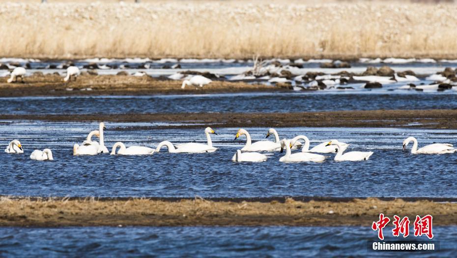 3月20日,天鹅在湖面上栖息。日前,内蒙古自治区呼伦贝尔市陈巴尔虎旗陆续迎来大量北归天鹅。据了解,每年四月份,成群的天鹅从中国南方迁徙到呼伦贝尔产卵繁殖,而今年三月中旬起,陈巴尔虎旗境内便迎来大量回归天鹅,实属罕见。中新社记者 武军 摄