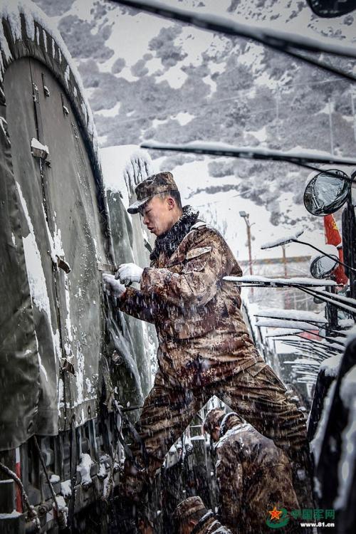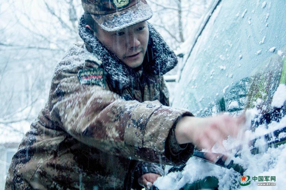 驾驶员清理挡风玻璃上的积雪。沈奥 杨元武 石梅树 摄影报道 图片来源:中国军网