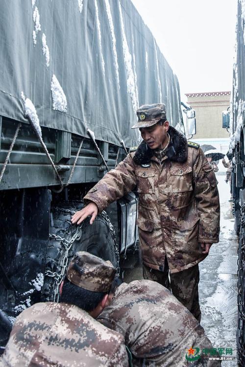 团长何继军检查车辆防滑链条加固情况。沈奥 杨元武 石梅树 摄影报道 图片来源:中国军网