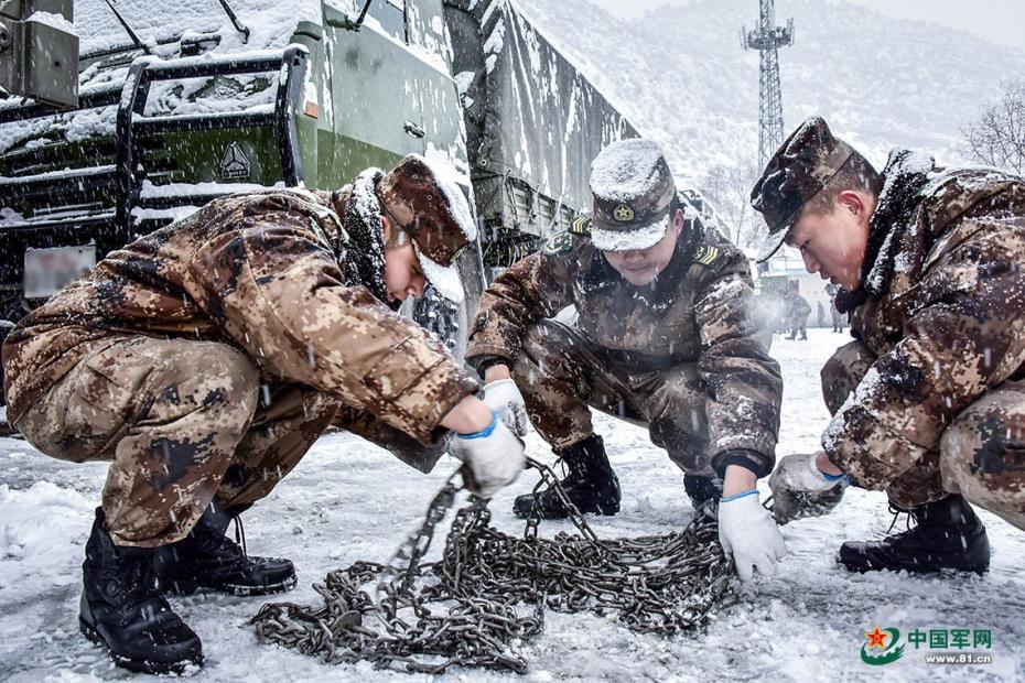 快速准备防滑链条。沈奥 杨元武 石梅树 摄影报道 图片来源:中国军网