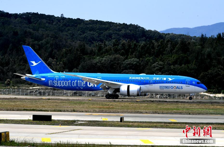 3月21日,厦航MF8116航班飞抵福州,飞机平稳落地后,其与众不同的外观迅速成为众人关注的焦点。这架飞机是全球唯一的联合国特殊涂装飞机,被命名为“联合梦想号”。飞机的机身主体使用蓝色覆盖,象征着美好、希望以及无限的未来;机腹的波浪形白色部分象征着孕育地球生命的海洋;机身印有“in support of the UN”(支持联合国)的标语,尾翼点缀有17项联合国可持续发展目标的标识。厦航积极践行“构建人类命运共同体”的“中国方案”,于2017年2月15日与联合国在纽约签署协议,成为全球首家与联合国开展可持续发展目标合作的航空公司。王东明 摄