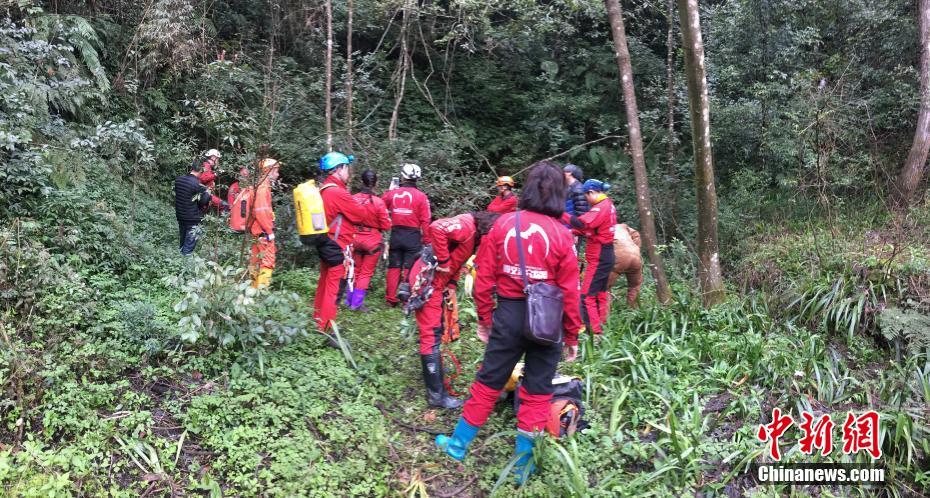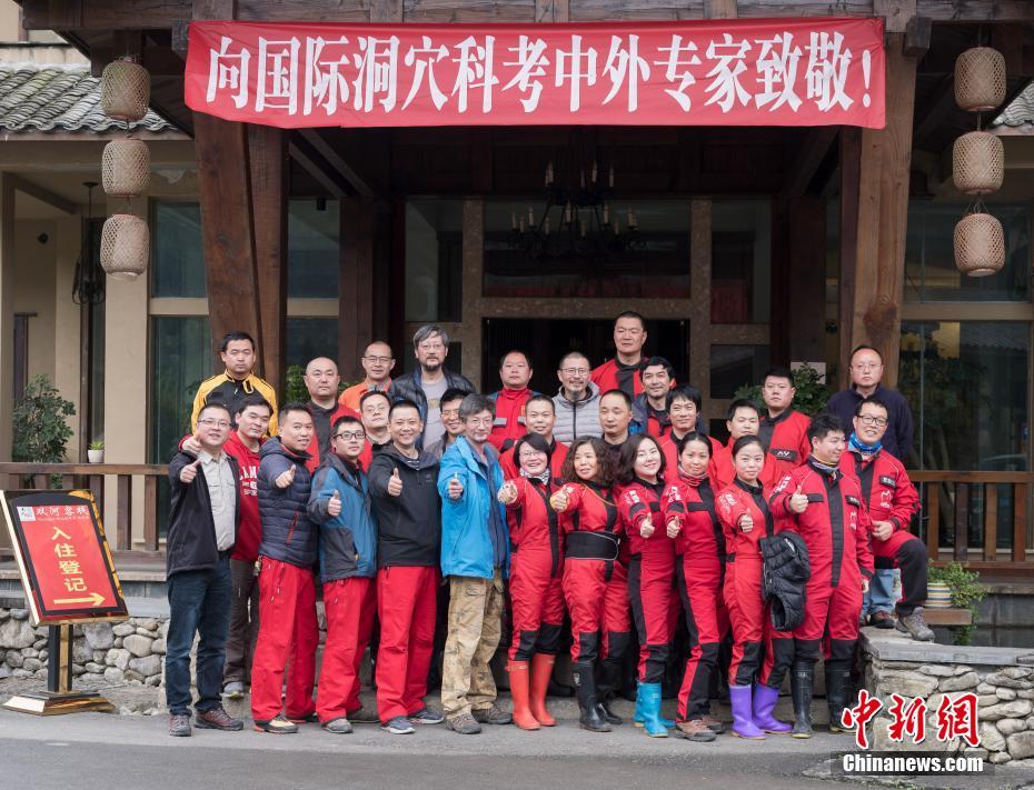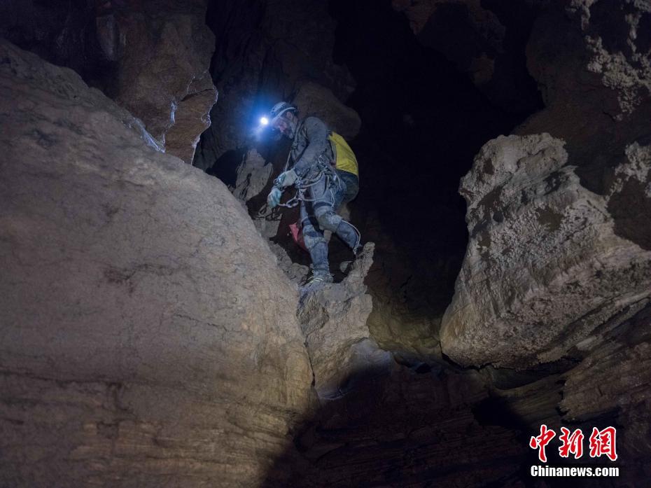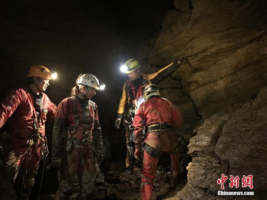 图为3月18日中外探险队员在进行野外作业。自1988年以来,双河洞吸引了海外探险家持续探测31年之久。截至2017年4月,完成探测长度达200.427公里,是世界排名第十的长洞。双河洞也是目前世界最长的白云岩和世界最大的天青石洞穴。 中新社记者 赵揭宇 摄