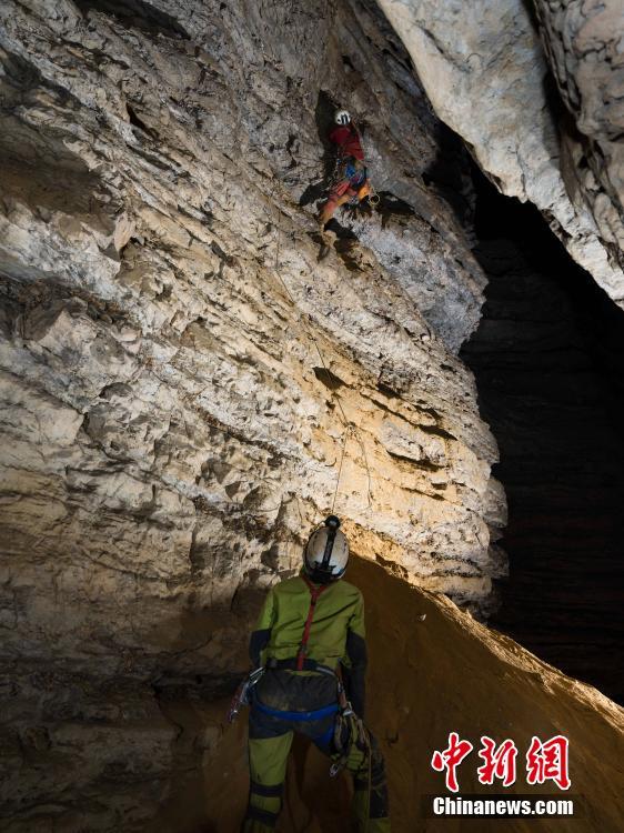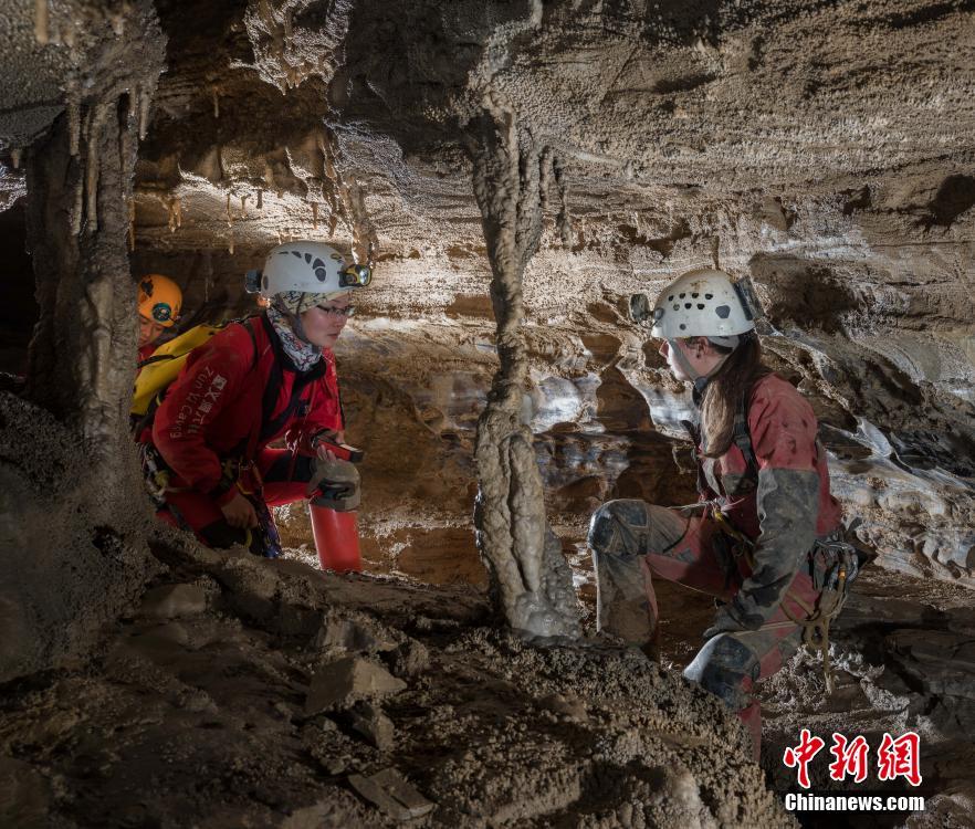 图为3月19日中外探险队员在溶洞中作业。 中新社记者 赵揭宇 摄