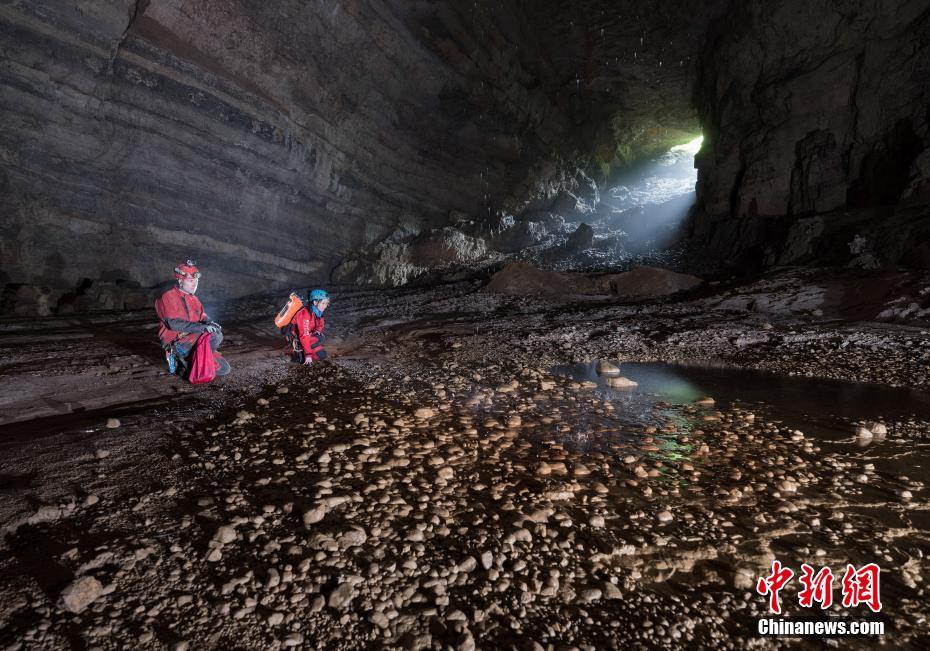 图为3月17日探洞队员在溶洞里作业。 中新社记者 赵揭宇 摄