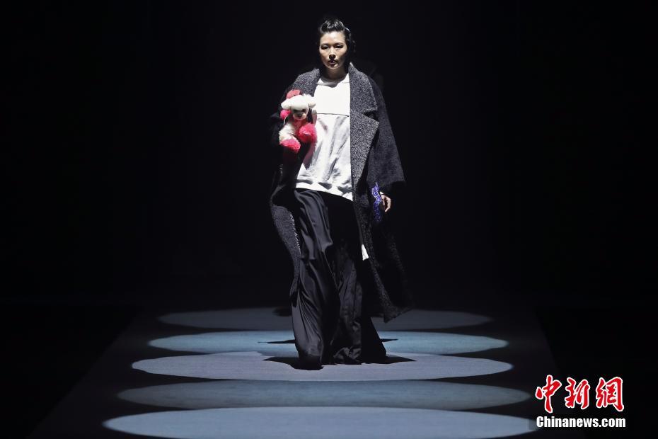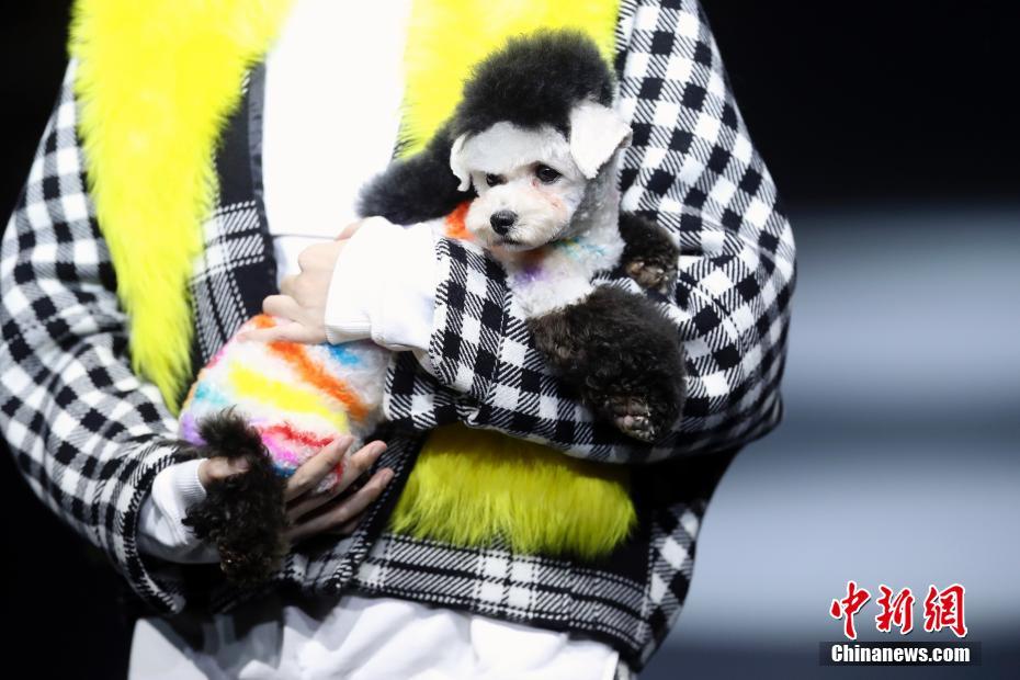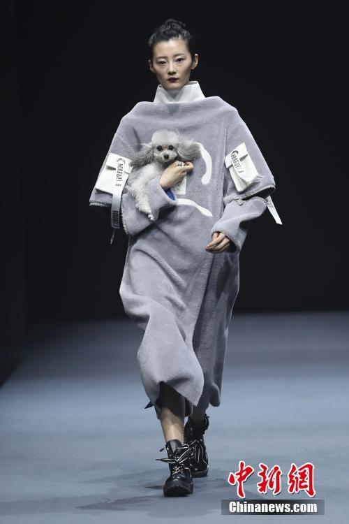 3月29日,模特怀抱宠物犬在T台上展示设计师史宏伟设计的时装。当日,史宏伟《Wild Faction(野派)》2018/19秋冬时装发布会在北京举行。