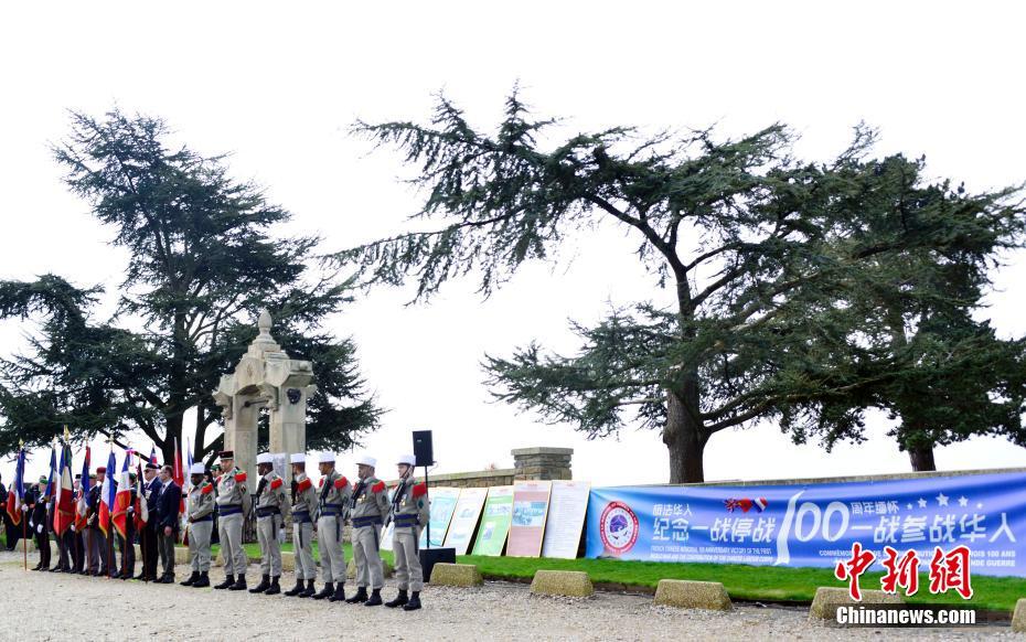 中法英三方和旅法华侨华人4月8日在位于法国西北部的诺莱特华工墓园共同举行纪念第一次世界大战停战100周年暨缅怀一战中国劳工仪式。图为法国外籍兵团退伍华人战友会成员出席仪式。 中新社记者 龙剑武 摄