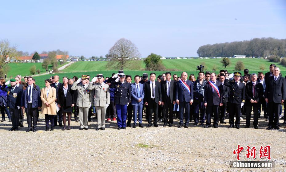 中法英三方和旅法华侨华人4月8日在位于法国西北部的诺莱特华工墓园共同举行纪念第一次世界大战停战100周年暨缅怀一战中国劳工仪式。图为中法英三方和旅法华侨华人代表出席仪式。 中新社记者 龙剑武 摄