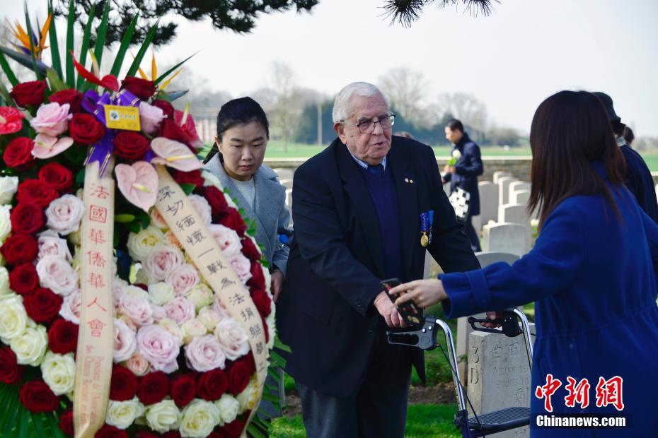 中法英三方和旅法华侨华人4月8日在位于法国西北部的诺莱特华工墓园共同举行纪念第一次世界大战停战100周年暨缅怀一战中国劳工仪式。图为出席仪式的民众向华工墓地献花。 中新社记者 龙剑武 摄