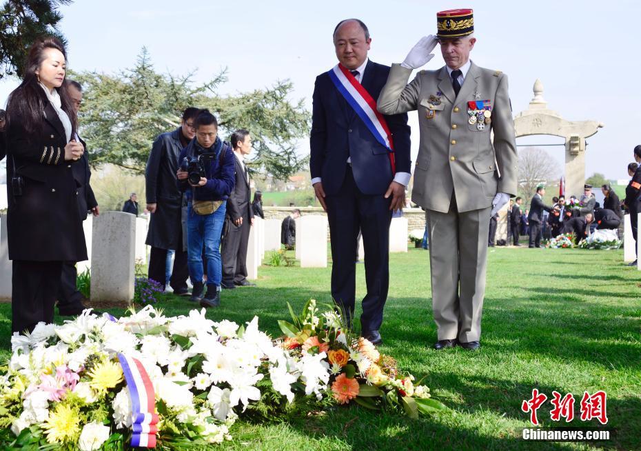 中法英三方和旅法华侨华人4月8日在位于法国西北部的诺莱特华工墓园共同举行纪念第一次世界大战停战100周年暨缅怀一战中国劳工仪式。图为法国国会议员陈文雄(左)和法军将领朗格洛瓦(右)向华工墓地献花。 中新社记者 龙剑武 摄