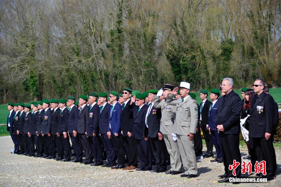 中法英三方和旅法华侨华人4月8日在位于法国西北部的诺莱特华工墓园共同举行纪念第一次世界大战停战100周年暨缅怀一战中国劳工仪式。图为仪式现场的法国外籍兵团仪仗队。 中新社记者 龙剑武 摄