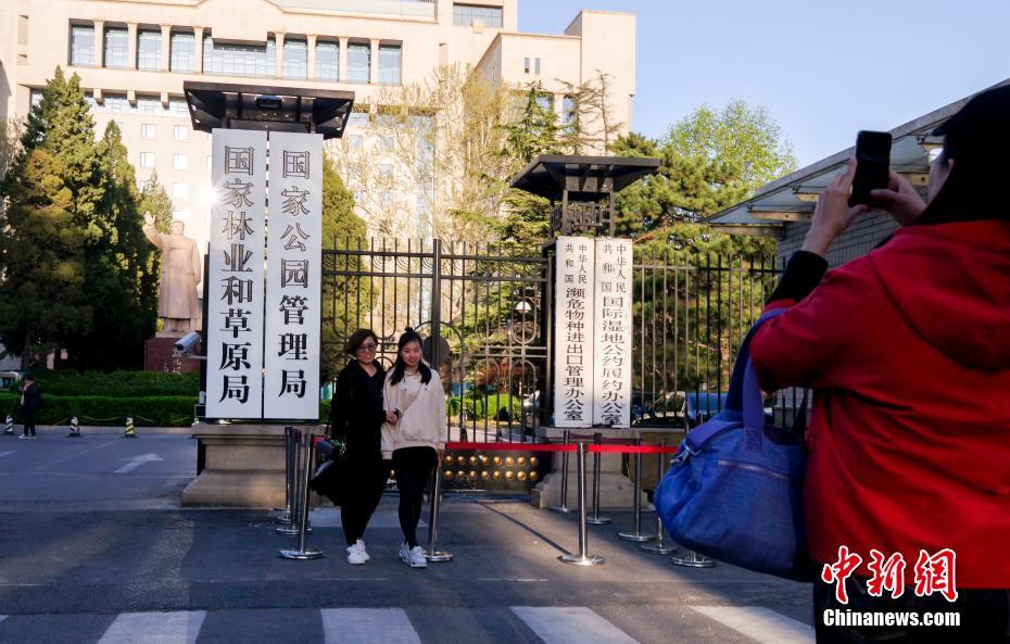 管理局在北京正式挂牌。图为民众与新牌合影。中新社记者 贾天勇 摄
