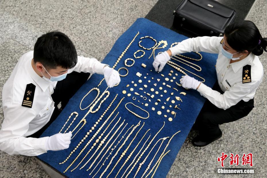 4月11日,广州海关通报,1-3月,该关在空港旅检渠道共查获象牙走私案件62宗,涉及象牙及制品24.16千克,同比分别增长1.38倍、2倍。图为近日海关关员清点查获的走私象牙制品。中新社记者 池兆恩 摄