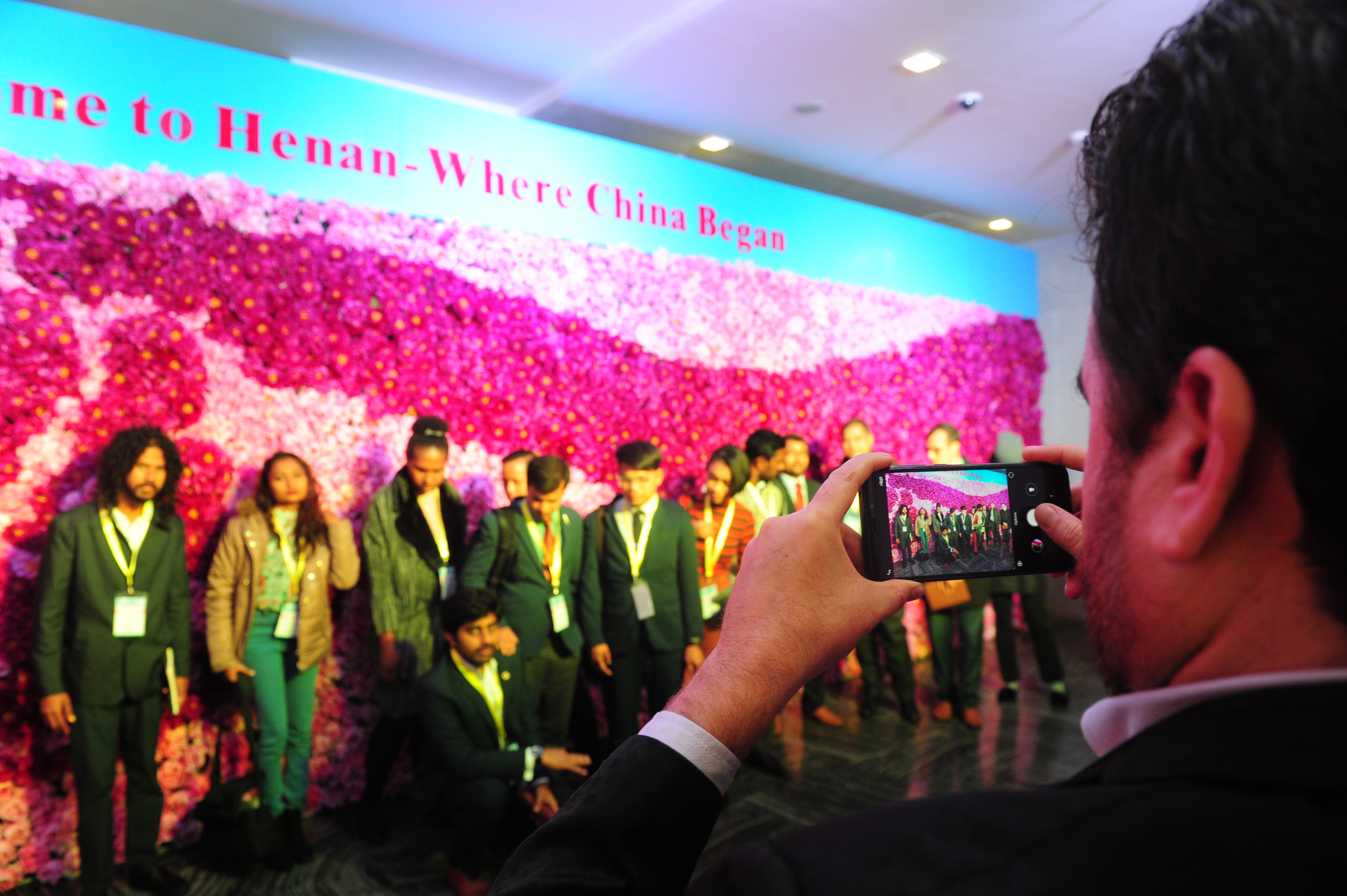 前来参加的国外记者争相在“中华源·河南欢迎您”迎宾墙前合影留念。