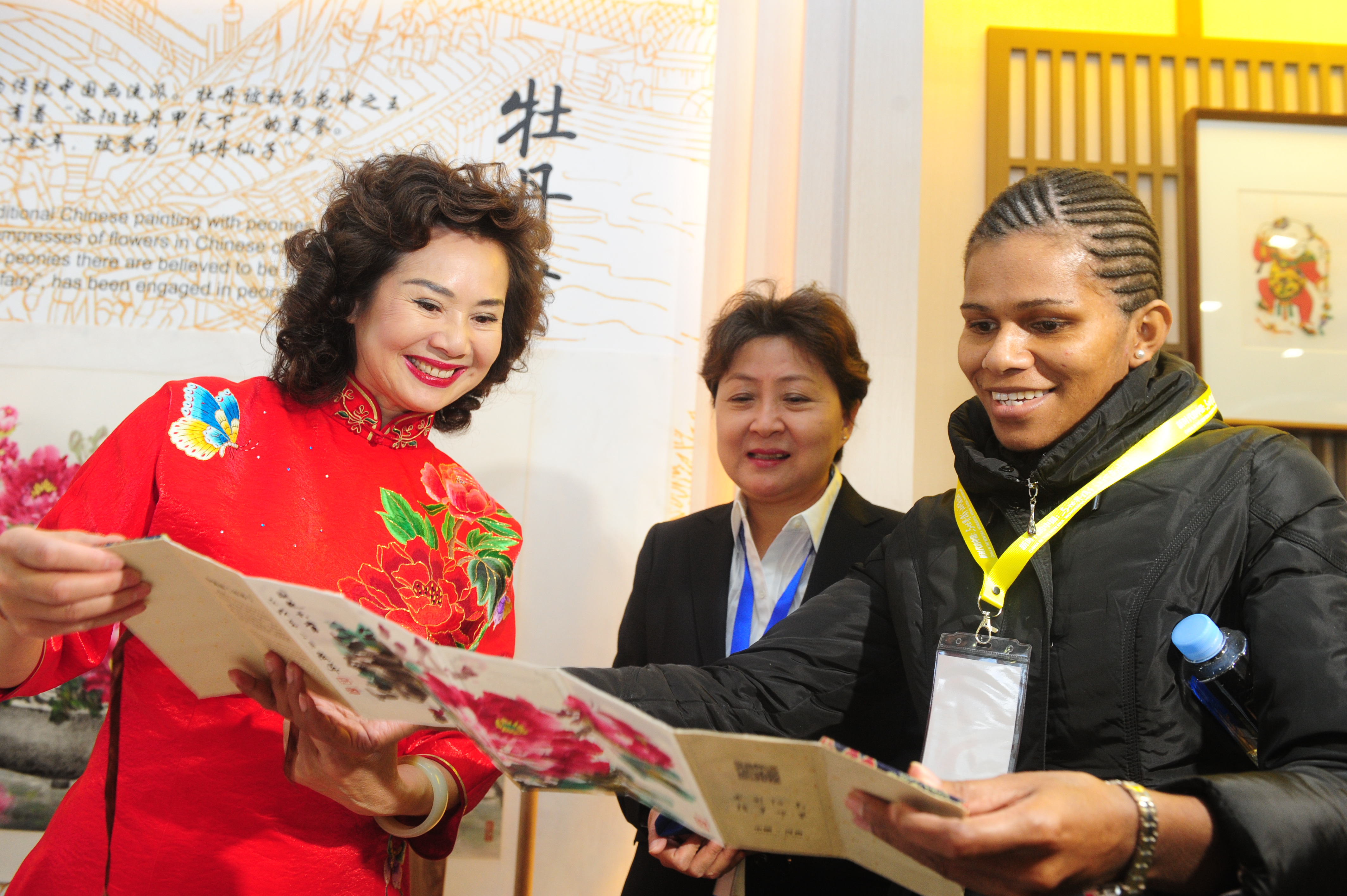 俄罗斯外交官对汴绣引起浓厚的兴趣,并用普通话与非遗传人程曼萍交流。