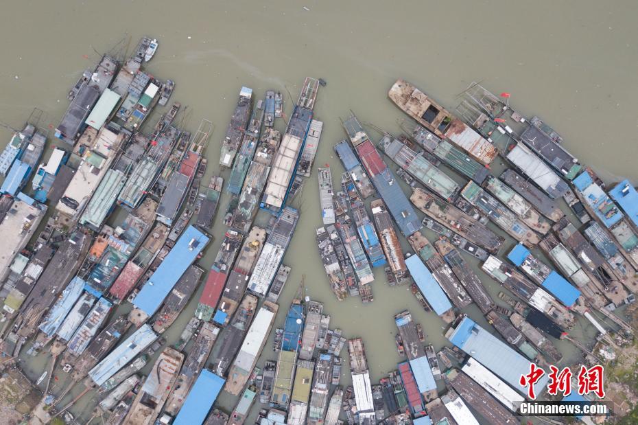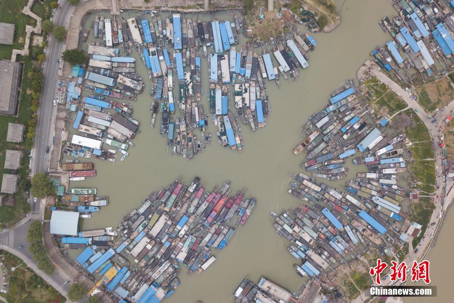 从空中俯瞰停泊着的上百艘渔船,排列整齐颇为壮观。中新社记者 泱波 摄