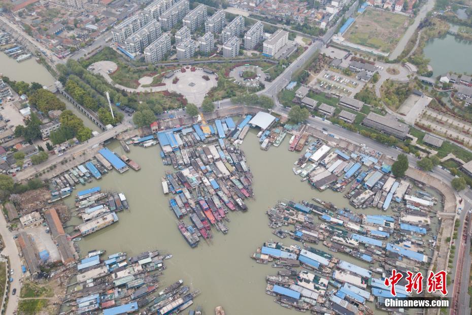 4月14日,在江苏淮安市洪泽区境内的洪泽湖畔,从空中俯瞰停泊着的上百艘渔船,排列整齐颇为壮观。