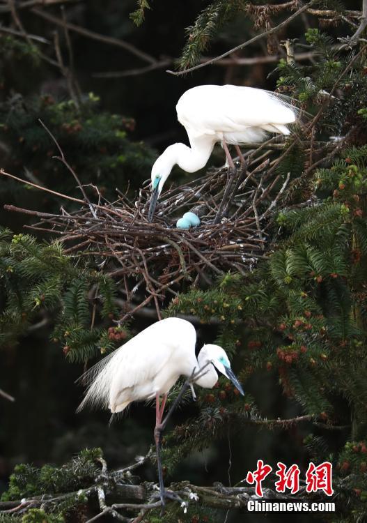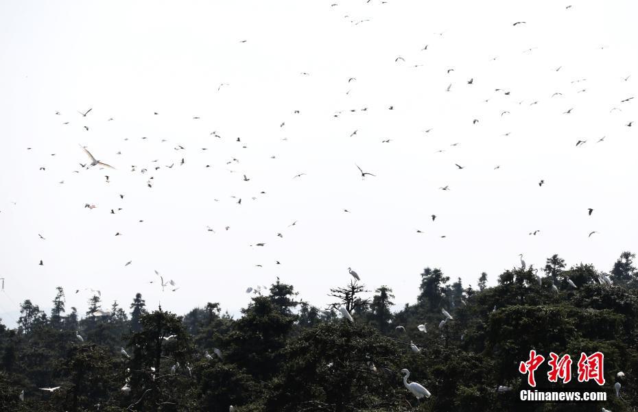 4月19日,在江西南昌市新建区的象山森林公园内,成千上万羽的白鹭在树林里或衔枝筑巢,或嬉戏打闹,或安静孵蛋。 刘占昆 摄