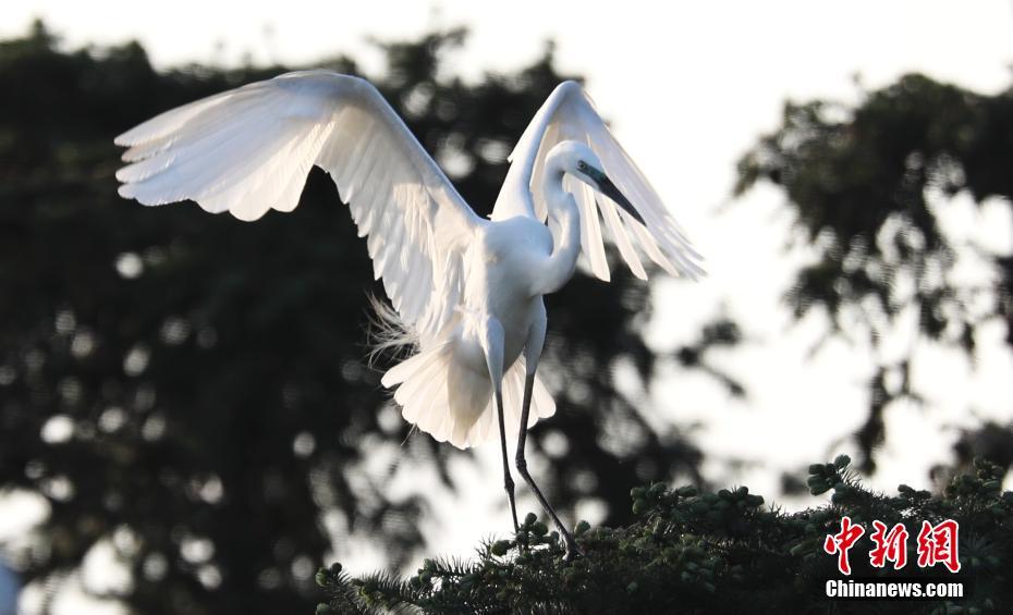 成群的鹭鸟或栖息在树上,或在林中穿插而过。 刘占昆 摄
