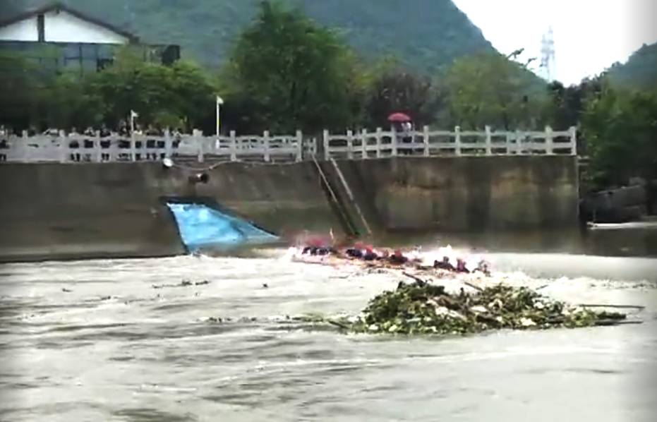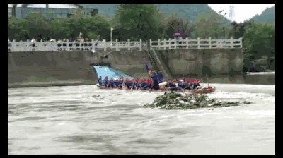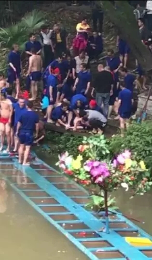 从目击者拍摄的视频来看,事发前一群身穿蓝衣的龙舟队员划着一艘黄颜色的龙舟在桃花江上进行练习。可当他们划到江中的橡胶坝附近时,龙舟突然打横,发生了侧翻。没过多久,另一艘龙舟也来到了事发地点。在橡胶坝附近转了几个圈之后,同样发生了侧翻。
