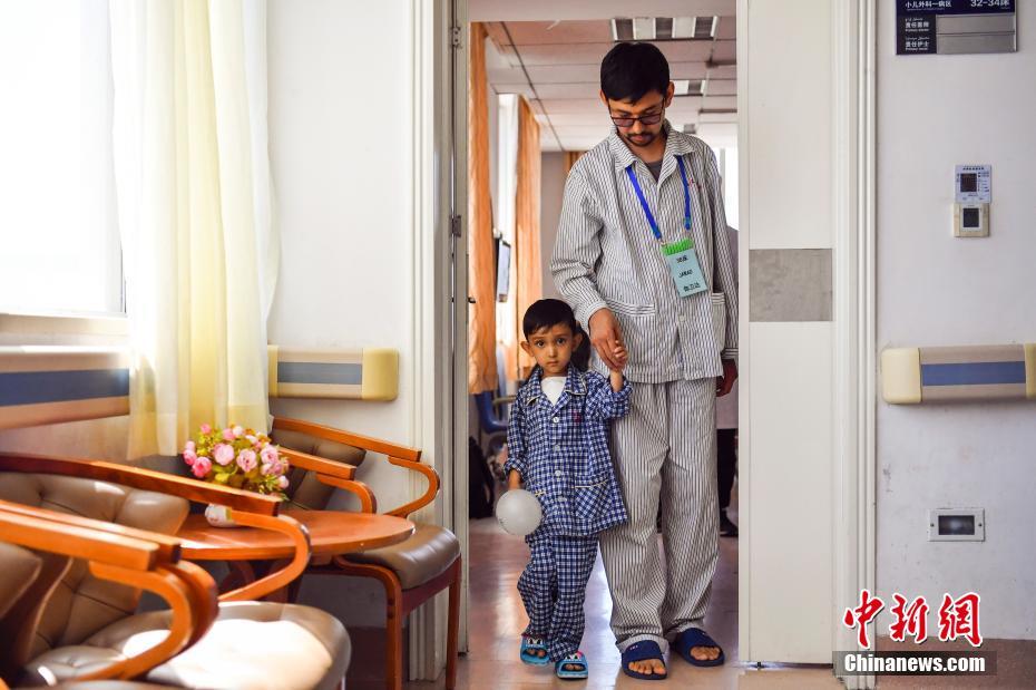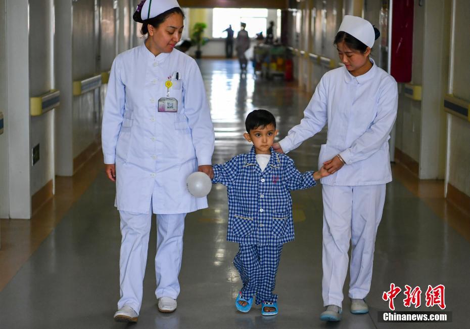 5月8日,新疆医科大学第一附属医院,来自阿富汗的先天性心脏病患儿伽卫达(音译)在护士的陪同下在病区里活动。5岁的伽卫达已完成心脏免费治疗手术,明日他将带着医院为其准备的免费药品跟随家长返回阿富汗静养。另一名患儿仍在术后留院观察中。至此,2018年度首批来华的25名阿富汗先心病患儿已全部完成免费治疗。据介绍,4月18日,阿富汗25名先心病患儿和其家长,在中国红十字援外医疗队的陪同下,从阿富汗喀布尔乘坐航班飞抵中国新疆,22名已完成手术治疗的患儿及1名不宜手术的患儿,已于4月25日,5月2日分两批返回阿富汗。中新社记者 刘新 摄